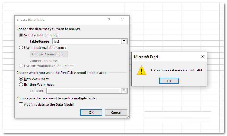 Si vous essayez d’insérer un tableau croisé dynamique dans une plage inexistante ou non définie, c’est là un autre motif de culpabilité. La référence à la source de données Excel n’est pas une erreur valide.