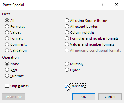 - Étant donné que Transpose est une formule basée sur un tableau, il est important de sélectionner le nombre exact de cellules