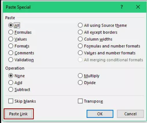 - Appuyez sur l’option Coller le lien et cela garantit que les références de cellule sont copiées en une seule formule