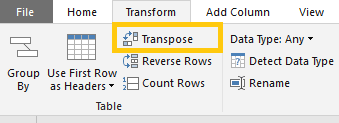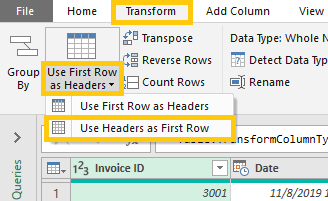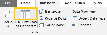 - Dans l’éditeur, visitez l’option Transformation et choisissez la section Table. Suivez ceci avec First Row comme en-têtes. Suivez ceci avec l’option Utiliser les en-têtes comme première ligne.